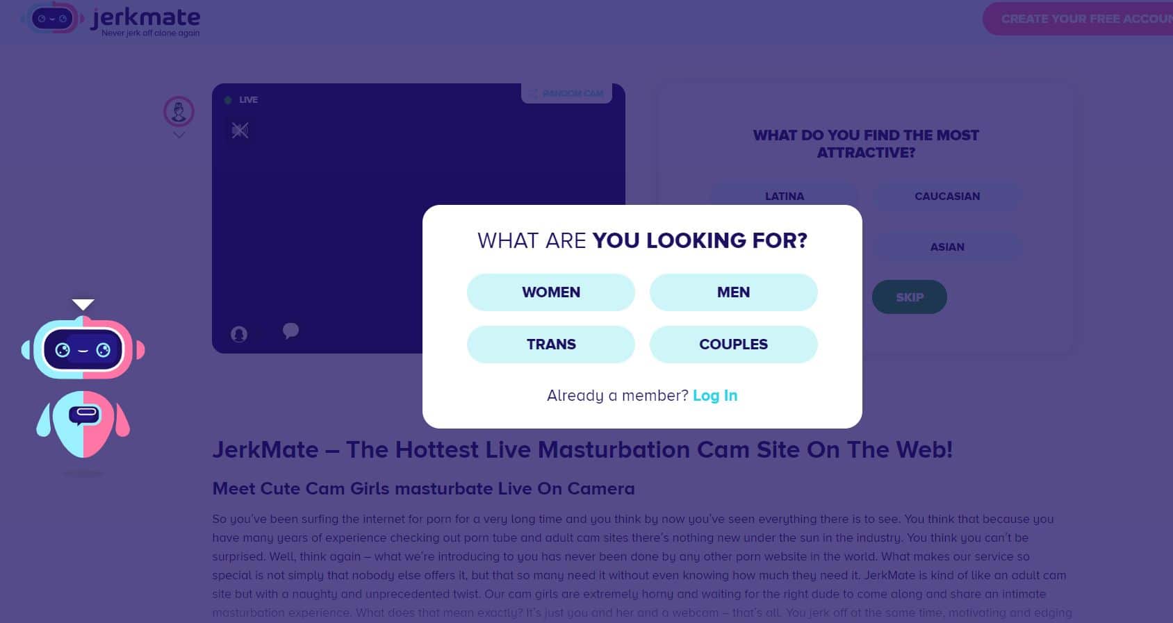 Jerkmate’s landing page uses a matchmaking questionnaire to pair up viewers with a random cam to enjoy. This not only disguises the site’s true identity but also teases new viewers into signing up for the site.
